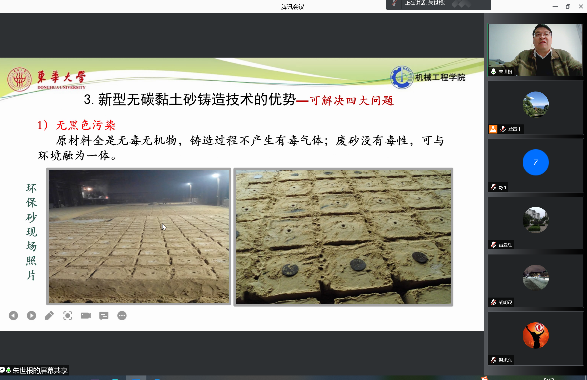 朱教授首先介绍了新型无碳粘土砂型铸造技术研究开发过程、关键技术及应用情况,该项技术是一项颠覆传统铸造行业的原创性技术成果,突破了铸造行业煤粉粘土湿型砂铸造技术长期存在严重污染的世界性难题,具有非常重要的应用价值,对国家实施“双碳”计划具有重要意义。