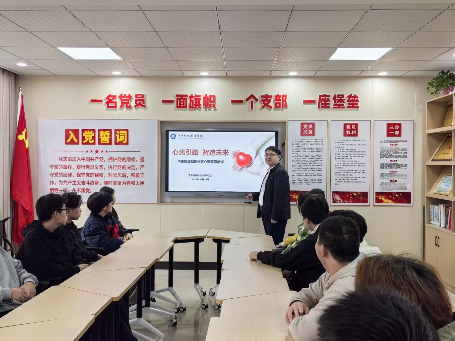 11月10日,汽车智能制造学院在机械楼J305和302会议室针对班主任和心理委员、寝室长分别开展“心光引路 智造未来”心理培训,培训会由学院党委书记崔海英和辅导员杜辰楠主讲。