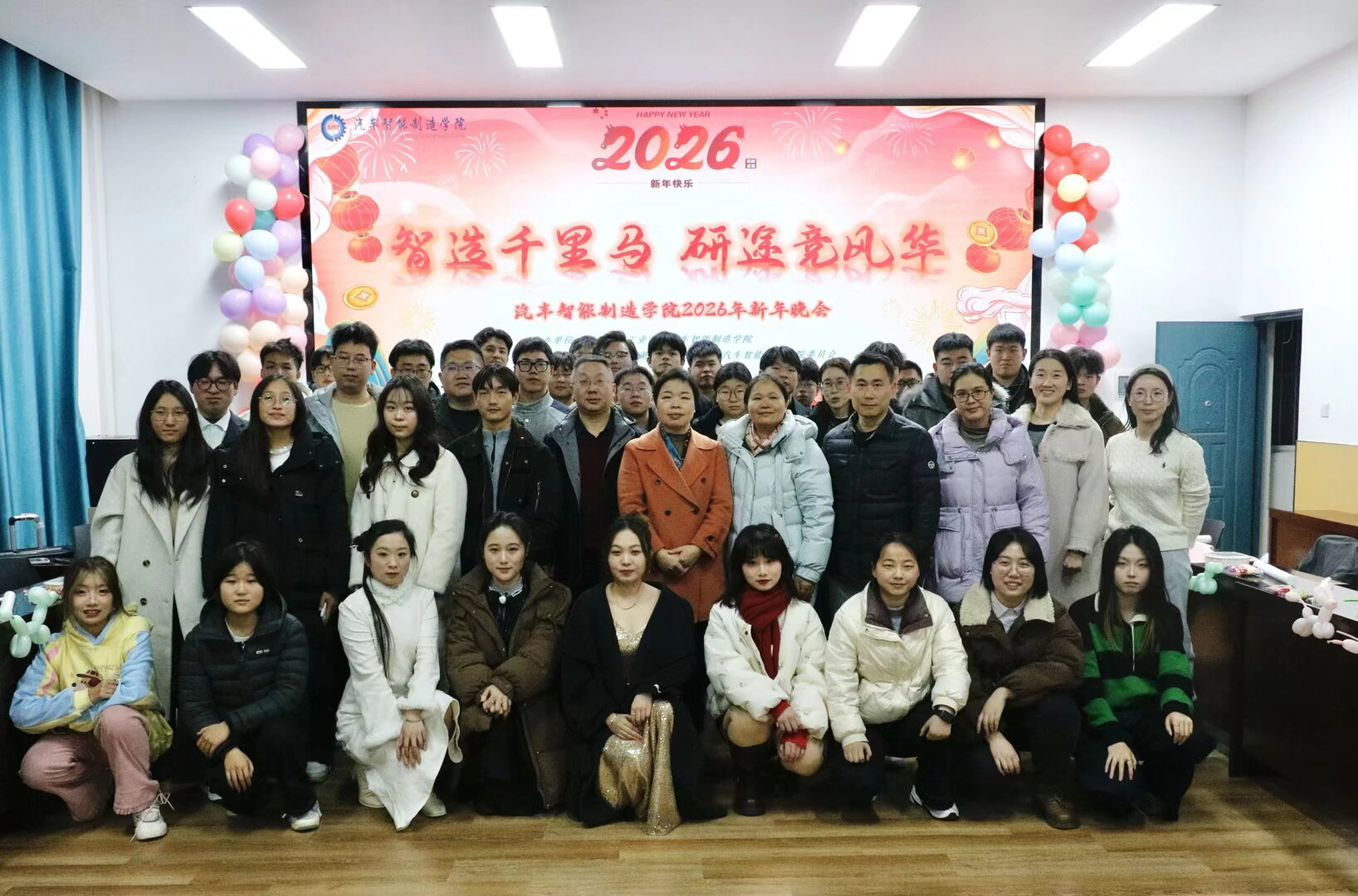 1月9日晚,汽车智能制造学院首届研究生新年晚会在学院J305会议室精彩上演。晚会以“智造梦想,逐梦新程”为主题,学院师生欢聚一堂,共迎新年。