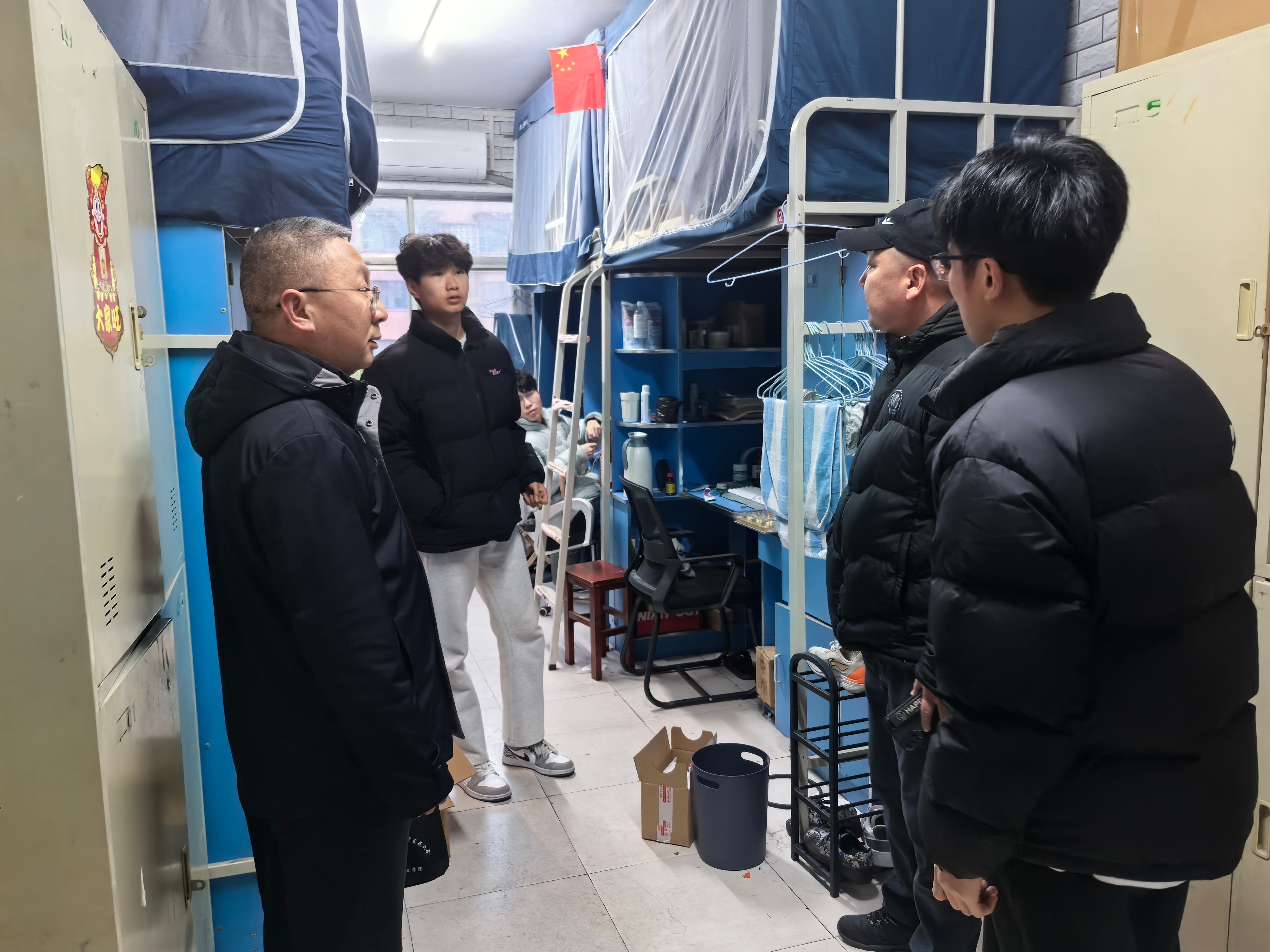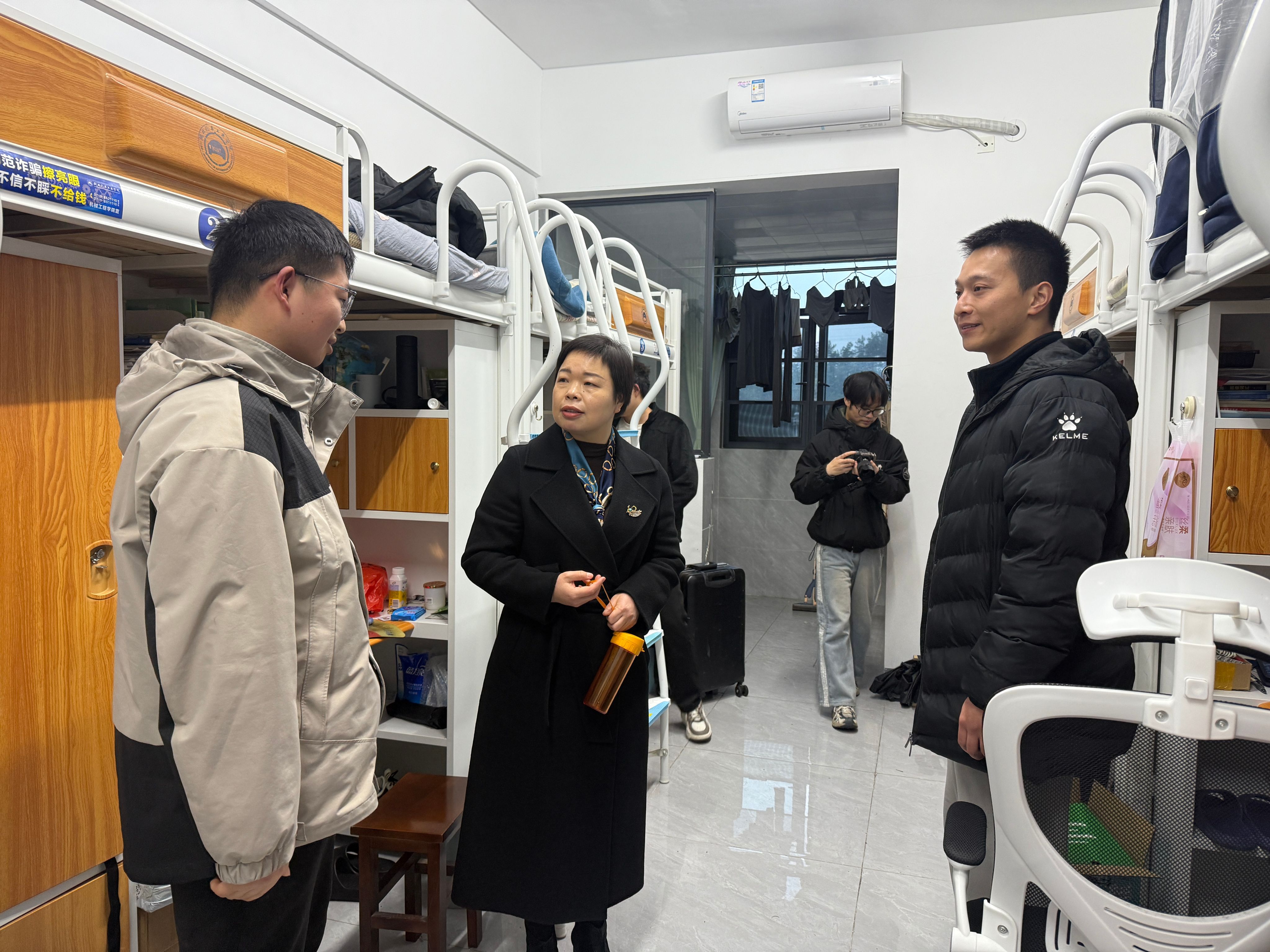 走访过程中,学院领导、老师们分组进入各年级学生宿舍,与同学们进行了亲切交流。“家是哪里的?”“假期过得怎么样?”“返程顺利吗?”每到一处,崔海英书记、马晓涛副书记都首先以拉家常的方式,细致询问同学们的寒假生活经历和感受,言语间充满了关怀与温暖。同学们也纷纷打开话匣子,分享假期的趣事和新学期的打算,宿舍里不时传来欢声笑语。