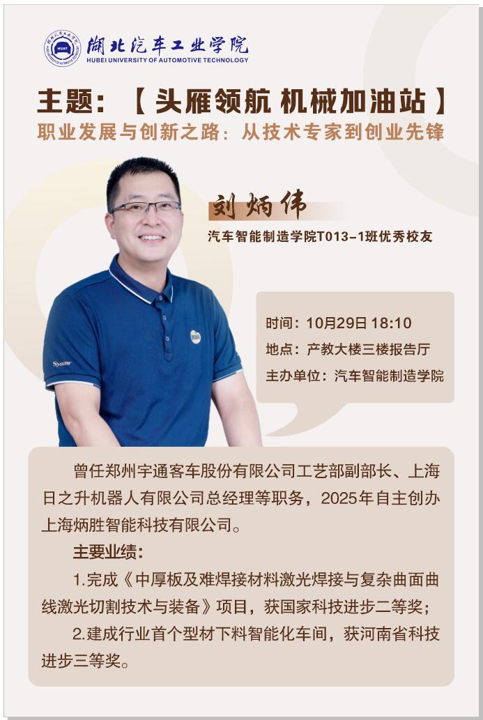 四、主讲人:刘炳伟,汽车智能制造学院T013-1班优秀校友