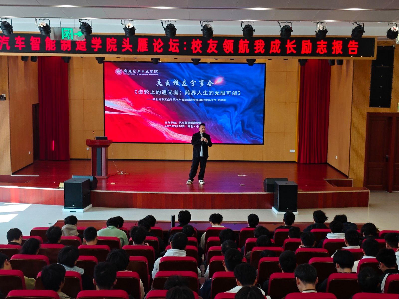 本网讯(文 曹天阳、陈君妍/图 万嘉颖)“校园经历对你从事主持相关工作起到了什么样的作用?” “是什么推动你从工业工程专业跨界到主持人行业?”为助力学生成长成才,明确未来发展职业生涯规划,3月10日下午,汽车智能制造学院特别邀请齐绵川(2002级工业工程专业校友、现任十堰市婚庆礼仪行业商会会长)在产教大楼四楼报告厅开展“头雁论坛:校友引领,筑梦远航”经验分享。